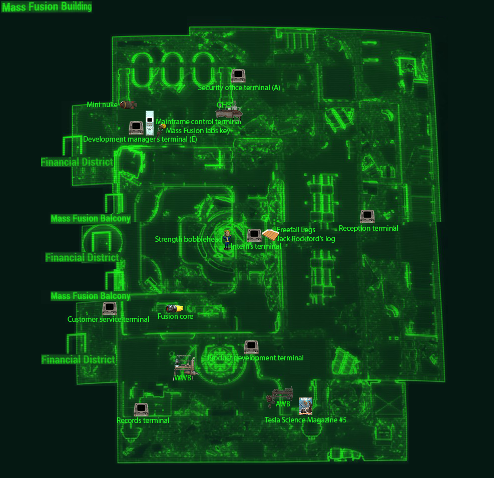 - Using a Brotherhood of Steel Vertibird, one can travel to the Mass Fusion building, and discover the Mass Fusion executive suite location en route. However, the elevator ID card needed for the Mass Fusion and Spoils of War quests does not spawn until the player character actually starts one of them. This may have been patched in a recent version of the game; The location does not appear discoverable before the appropriate quest.