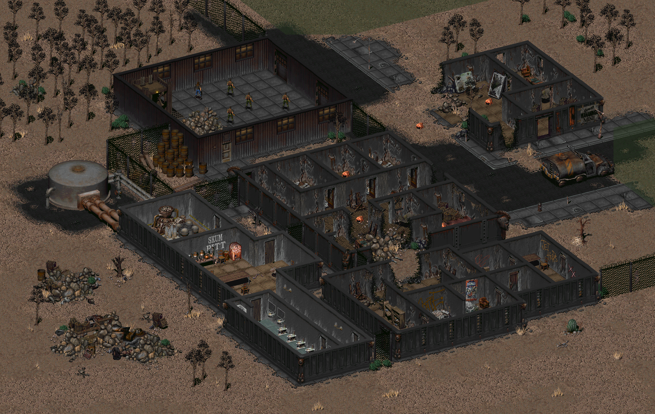The fenced-off building in the west appears to be the "Skum Pitt" and looks like a drinking establishment. In Fallout, the Skum Pitt bar can be found in Junktown.