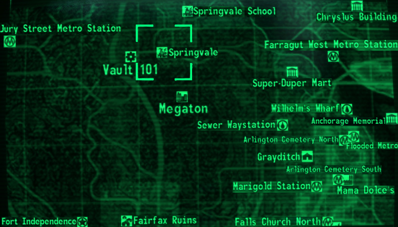 | | Abandoned camp · Abandoned tent · Francis Scott Key Bridge · Calverton · Camp RHO · Car dealership · Concrete treehouse · Cratered hamlet · Drainage chamber · Exploding scientist truck · Festive raider camp · Bannister crater · Freeway raider encampment · Ghoul outpost · Hilltop farm ruins · Hollowed-out rock · Internment truck · Irradiated outhouse · Lucky's · Military checkpoints · Minefield power substation · Monorail train wreckage · Musty caverns · Overlook raider shack · Patriotic picnic area · Pirate Pely · Potomac River · Pylon shack · Raider canal · Raid shack · Raider farmhouse · Raider shop · Raider wreckage fortifications · Riverside raider shacks · Rockopolis · Scavenger's bridge (Mole rat race track) · Scavenger's jetty · Scavenger shack · Shelter · Super mutant bonfire · Talon Company camp · Wasteland gypsy village · Wastelander lake hideout · Wastelander campsite · Willy's grocer |