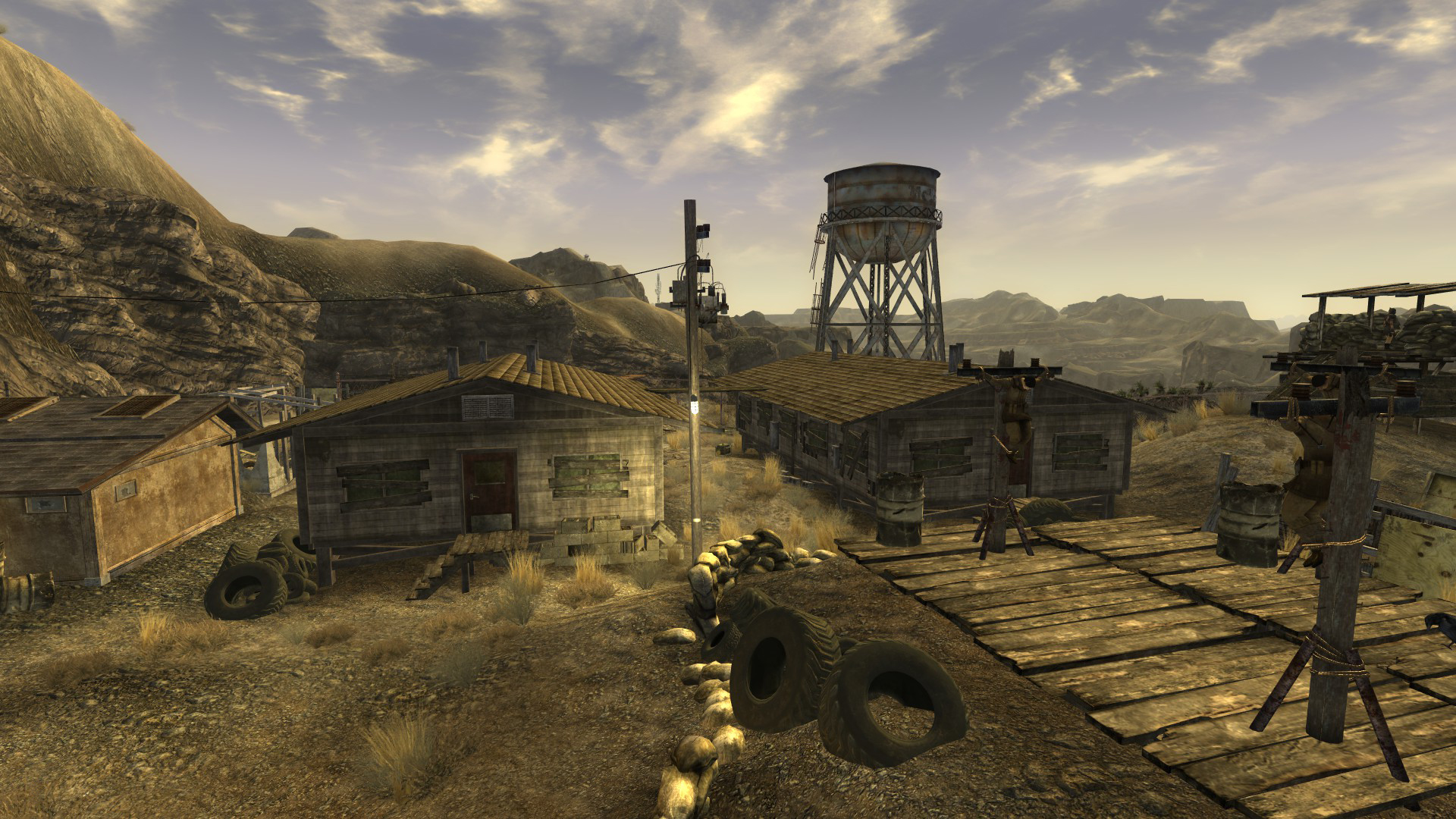 A pair of buildings with the interiors consisting of bunk beds flanking both sides of the room with footlockers at the end. There is a first aid box next to the bathroom door. In the bathroom, there is a dead NCR trooper , carrying a dogtag , and irretrievable armor. There are also various duffle bags strewn about the barracks. In between the beds, several tables and footlockers can be found. Crates containing Sunset Sarsaparilla litter the floor. Filing cabinets flank both sides of the bathroom doorway.