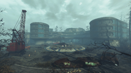 Outside of the hotel is the main, yet inaccessible entrance to the Vault, where a car can be seen parked on top of the cog-like elevator entrance, serving as a traffic rotary in its current and previous state.