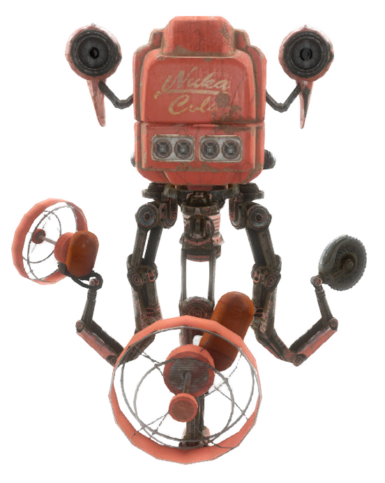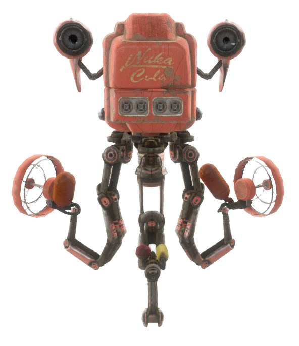 Mr Frothy is a unique, Nuka-Cola inspired variant of Mister Handy located in Nuka-World. Its torso is specially altered to be cubic and is painted red with the words "Nuka Cola" written on front, in its usual font. At the end of each of its arms is a red fan, which were used in conjunction with pressurized tanks in Mr Frothy's torso to spray guests with Nuka-Cola before the war. The raiders in Nuka-Town USA can sometimes be heard commenting on this. In 2287, the spray deals direct damage in addition to radiation damage to its targets.