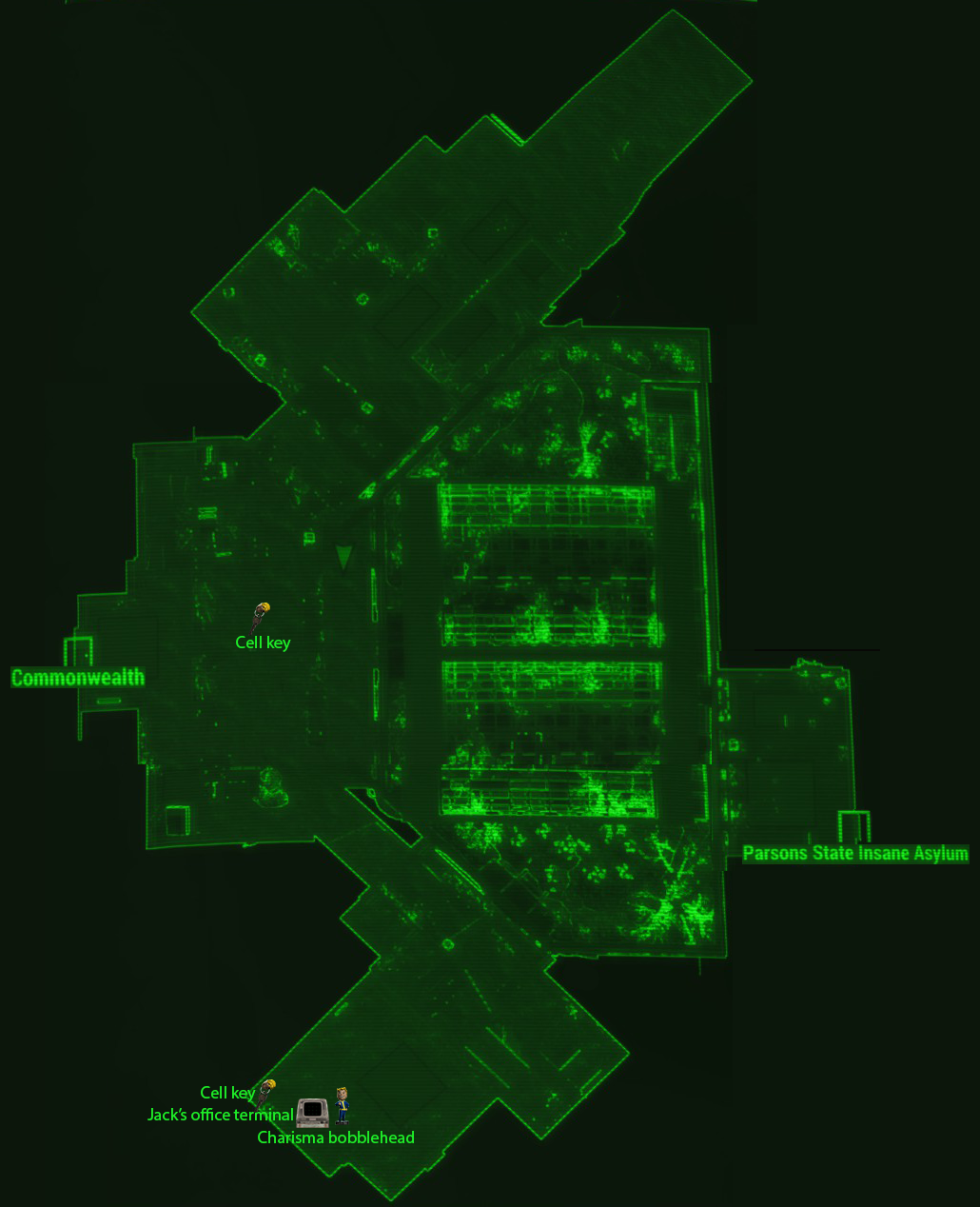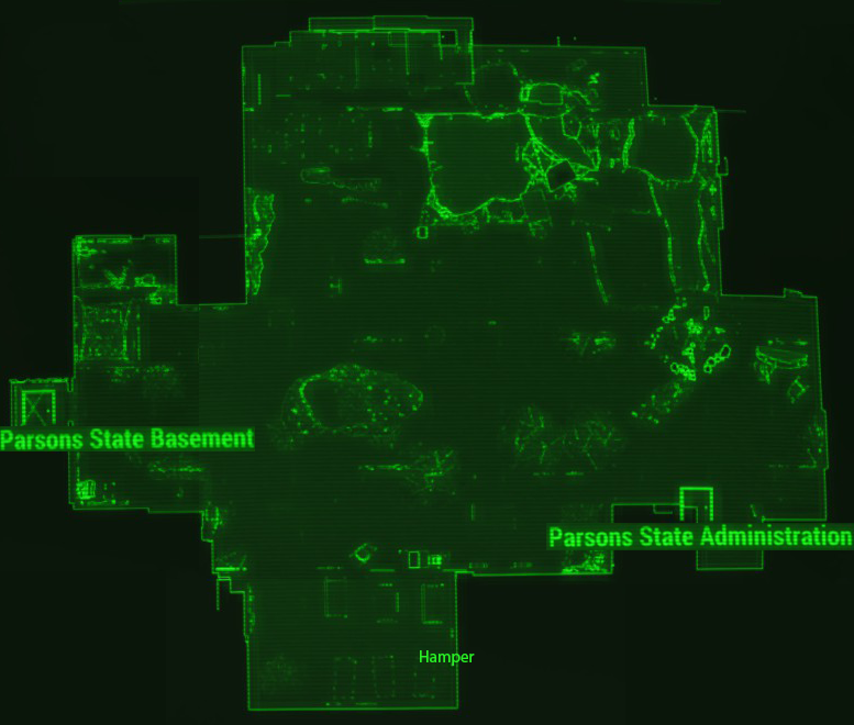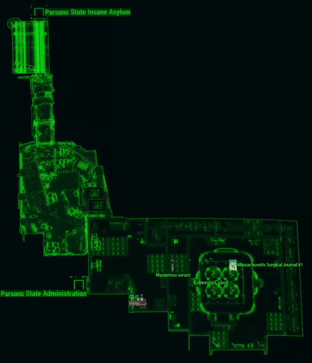 One may be given this location on the Pip-Boy map by a settler at Greentop Nursery. As the settler is approached, they say "the Parsons State Insane Asylum should be avoided." The map marker is then added to the Pip-Boy.
