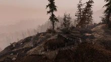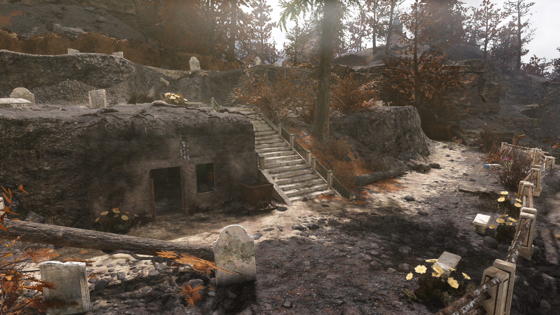 A trail leads down to the cemetery from behind the stage in the northeastern part of Lewisburg. The graveyard is divided into three descending levels. Many of the graves have a personal item, such as a mining helmet, next to them, or are adorned with carrot flowers. There are also multiple safes here, two of which can be unlocked with a Picklock level of 3. Some are already opened, indicating a history of grave-robbing alongside some other dug-up coffins. There is a small mausoleum on the bottom terrace with another coffin and an explosives crate inside.