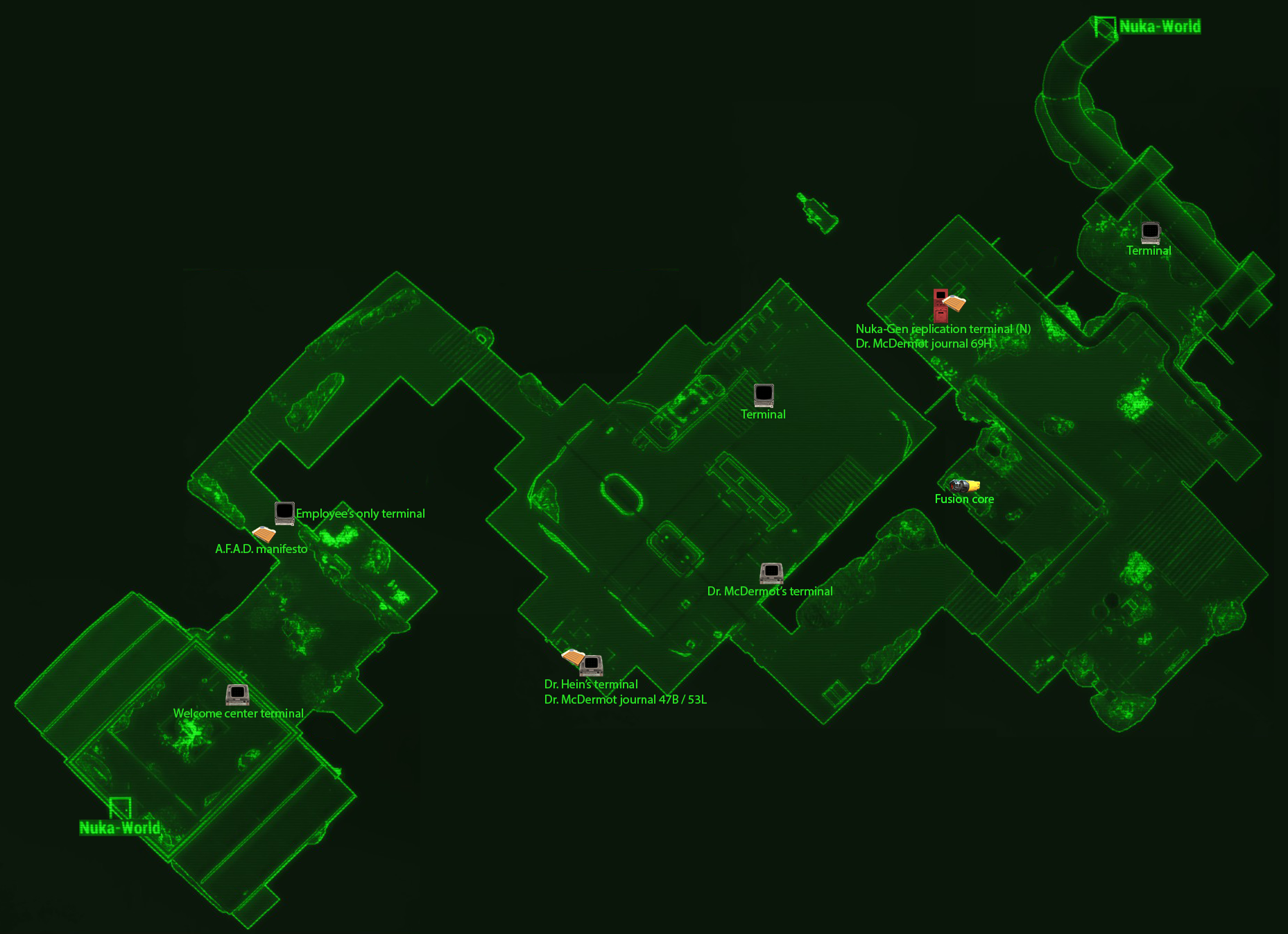 小島 ·阿卡迪亚 ·Aldersea Day Spa ·原子之神泉水 ·Beaver Creek Lanes ·Briney's Bait and Tackle ·Brooke's Head Lighthouse ·Children of Atom shrine ·崖边大饭店 ·Cranberry Island Bog ·Cranberry Island Docks ·Cranberry Island supply shed ·Dalton farm ·DiMA's cache ·鹰谷皮革工厂 ·伊甸汽车影院 ·Echo Lake Lumber ·匕港鎮 ·Fringe Cove docks ·Glowing Grove ·Haddock Cove ·Harbor Grand Hotel ·Horizon Flight 1207 ·Huntress Island ·Kitteredge Pass ·Longfellow's cabin ·杜鹃花号货轮 ·Nakano residence ·National Park campground ·National Park visitor's center ·国家公园总部 ·Northwood Ridge Quarry ·Oceanarium ·Old Pond House ·Pine Crest Cavern ·Radiant crest shrine ·Rayburn Point ·Red Death Island ·Rock Point Camp ·Ruined church ·Southwest Harbor ·原子核会 ·船艦 ·118号避难所 ·活力汽水工厂 ·浪波孤儿院 ·Wind farm maintenance ·Zephyr Ridge Camp