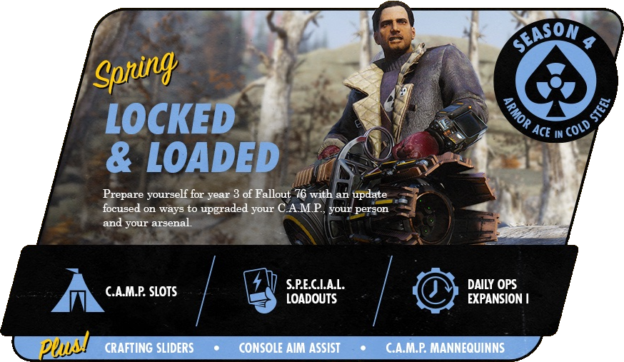 - ↑ Jeff Gardiner: "Which feature are we most excited for in our next update, Locked and Loaded? CAMP slots, SPECIAL load outs, or new Daily Ops expansion? Expect to hear more in the common weeks! #Fallout76"