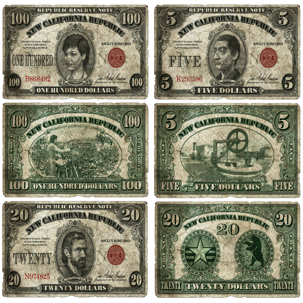 Chomps Lewis: "Nope. The NCR's been trying to switch over to using paper money, like in the Pre-War days. Trouble is that the exchange rates ain't exactly fair. For example, a hundred bucks in NCR money is valued at roughly half that in caps around here. Seems like a rotten deal for us, but work is work." (Chomps Lewis' dialogue)