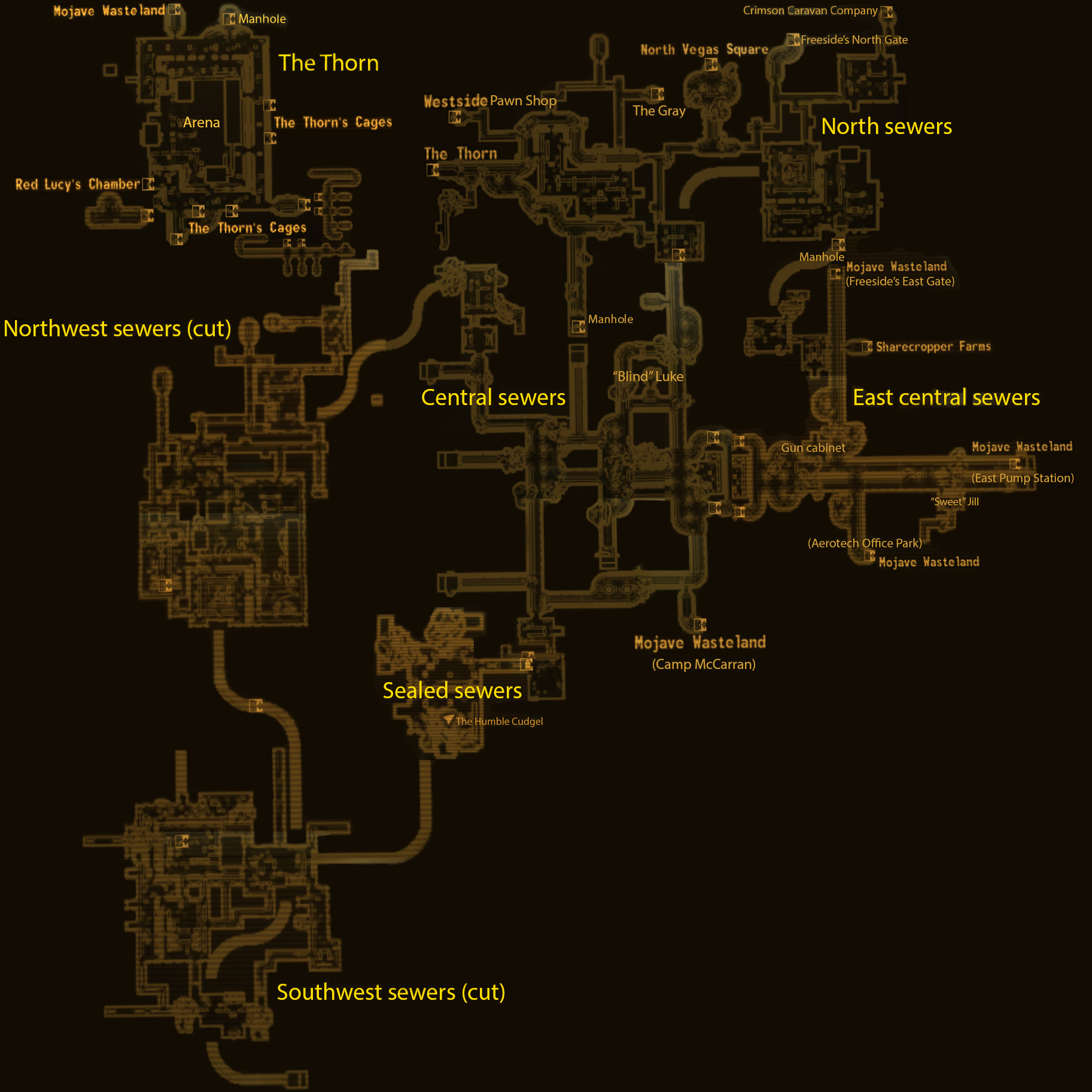 横跨相当长的地下新維加斯,下水道由迷宫般的隧道组成,里面有巨鼠,狂屍鬼和惡魔幫帮派成员。下水道系统的某些部分居住着从上面的城市撤退的流浪者。