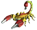 The robo-scorpion is a special security robot produced by the Big MT research company to serve as robotic guardians for the Big Mountain Research and Development Center. They have a scorpion form with a yellow body, two red pincers, red tail, and green trim along the side of the body and the tail.