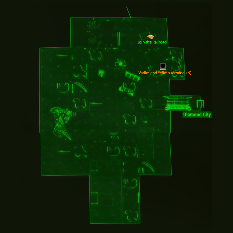 This building in the city's southern dugout is a single-floor structure with a lobby bar and several rooms. A wanted poster for the quest Diamond City's Most Wanted is on the wall of the entrance corridor leading to the lobby. A Port-A-Diner is just to the right of the lobby entrance, and an unmarked bedroom farther to the right, opposite the kitchen, features Vadim and Yefim's Novice-locked terminal. An Advanced-locked storage room is at the end of the corridor behind the bar.