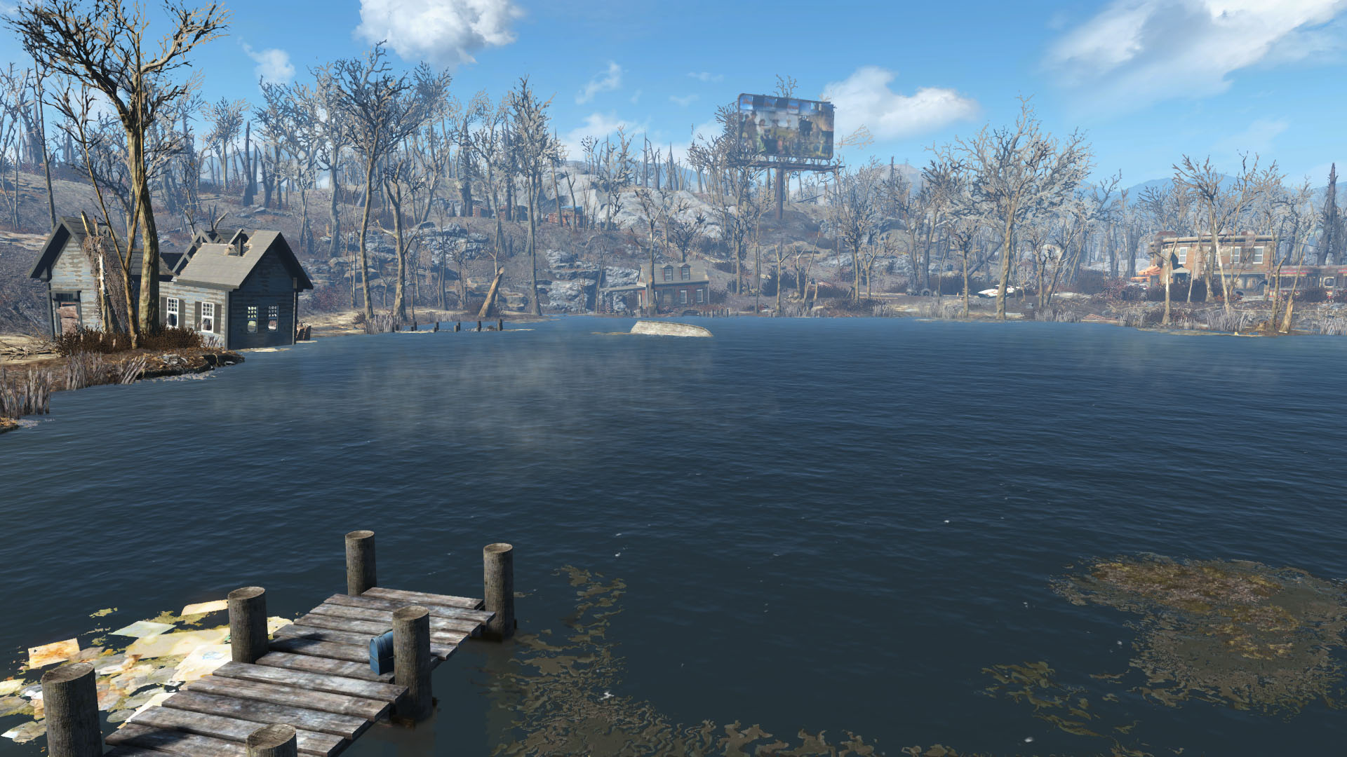 湖周围有多个码头,水中间有一艘倾覆的船。在北侧可以找到多个骷髅:一个坐在露台椅子上的人在它附近的地面上有一个冷藏箱 (在这个骨架下,水中还有一个隐藏的工具箱),另一个坐在轮椅上,地上放着霸力丸 ,第三个坐在浴缸里,旁边放着核子可樂量子口味 。