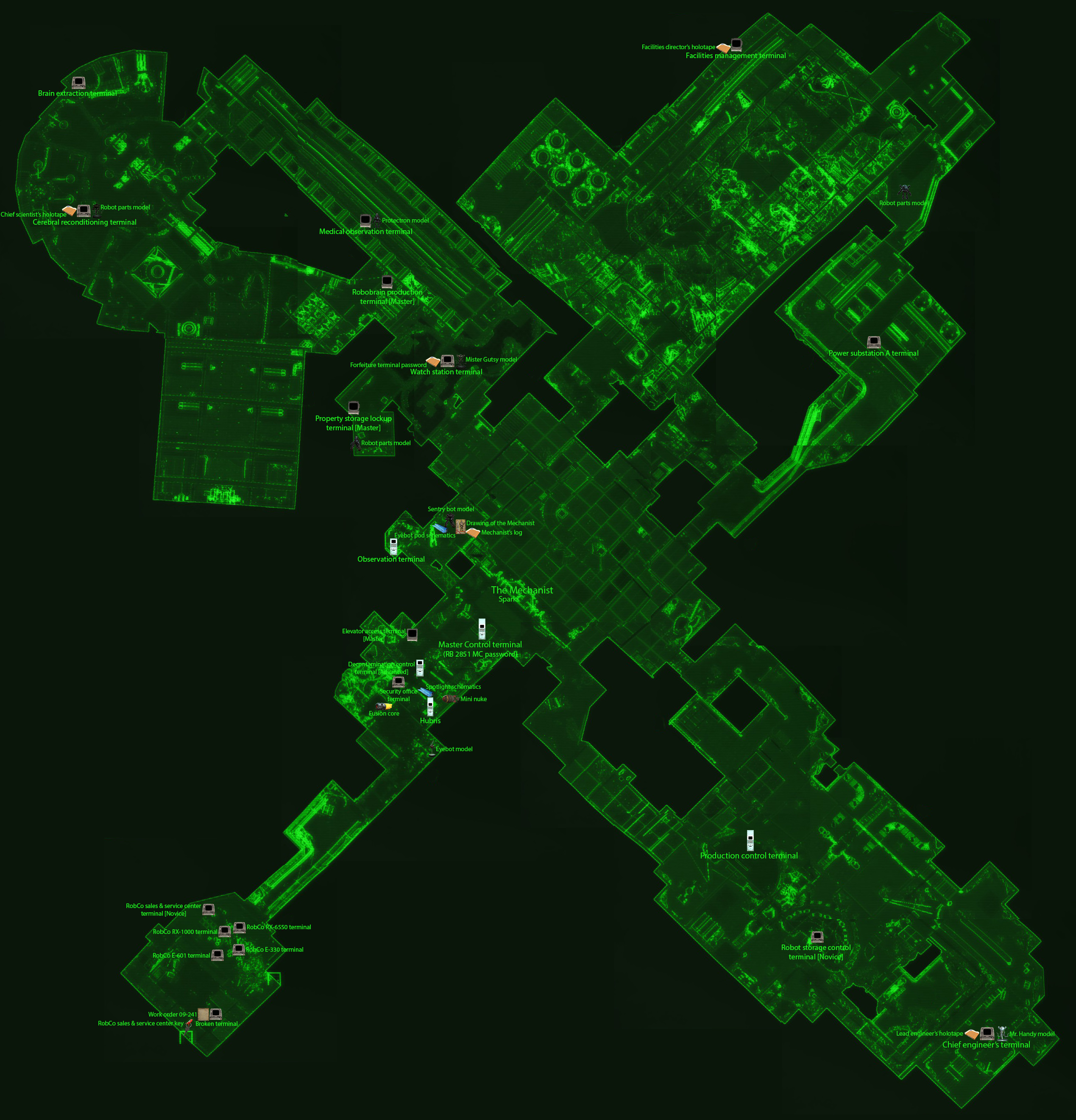- The player character can confront the Mechanist directly by loading the lead engineer's, facilities director's and chief scientist's holotapes into the terminal in the room directly next to the decontamination/laser tripwire hallway near the lair's entrance, lifting the security lockdown and enabling the use of the elevator.