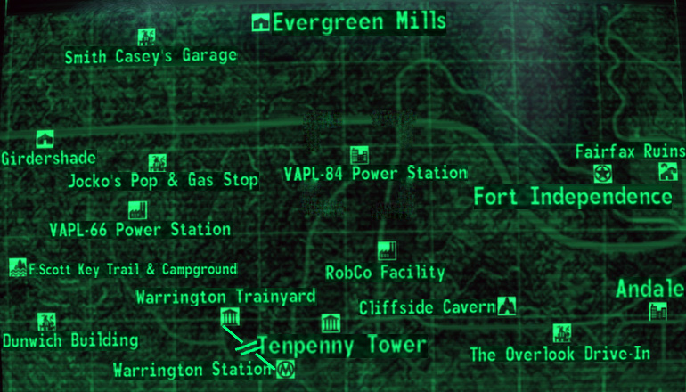 The Warrington Tunnels are a series of ruined subway tunnels under Warrington, located in the southwest of the Capital Wasteland. The tunnels go between Warrington Station (southwest of Tenpenny Tower) and Warrington Trainyard (west of Tenpenny Tower). The tunnels are populated by Ghouls.