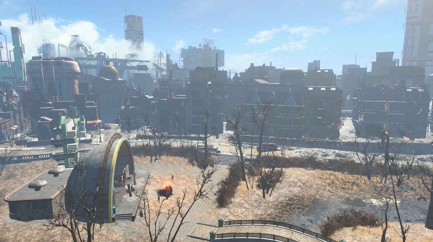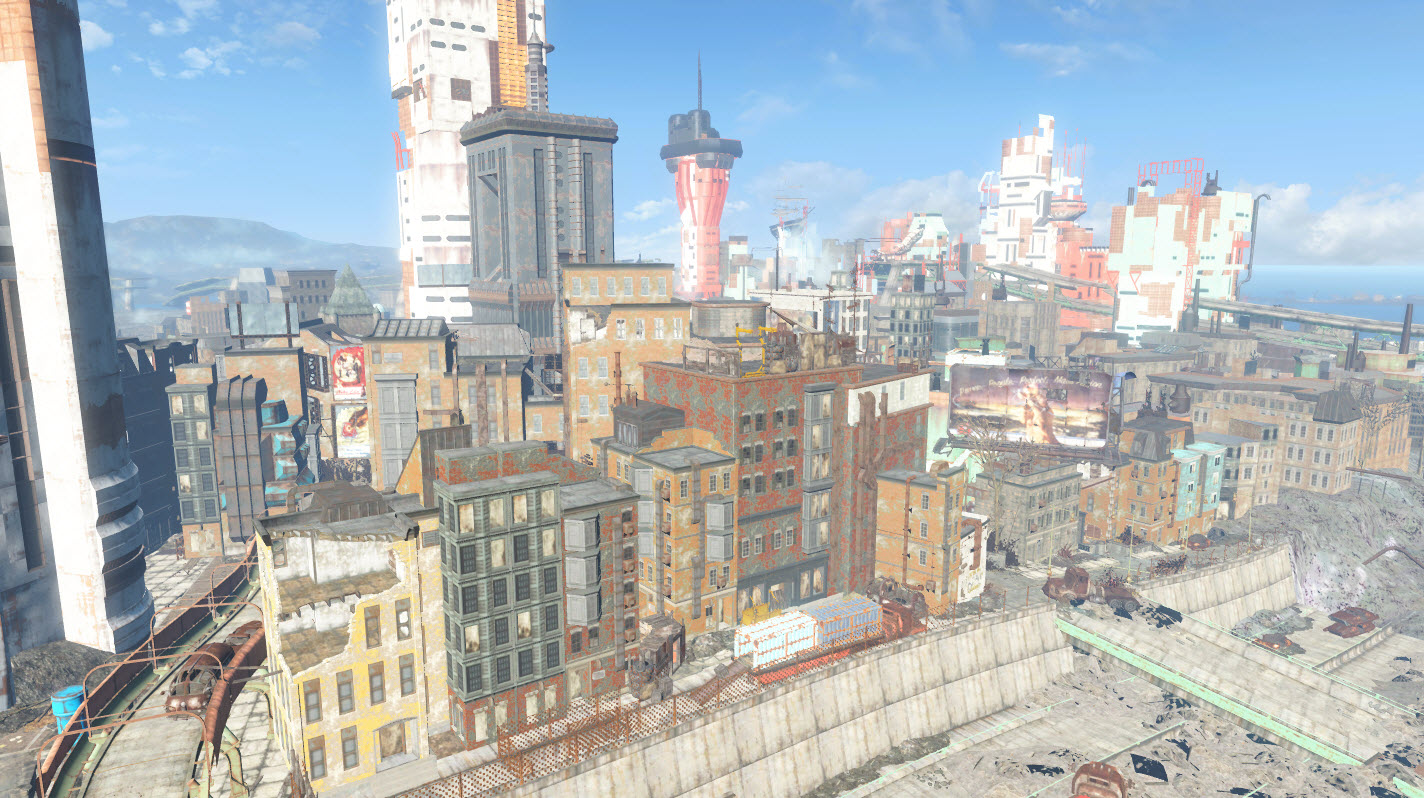 Many of these structures did not survive the Great War intact. Over time, parts of buildings if not entire buildings have collapsed, littering the streets with their rubble. What structures are left standing often have gaping holes and whole missing sections, the tallest of which are sometimes no more than skeletal. The end result is that enterprising explorers are just as likely to fall to death as they are to succumb to the hostile super mutants, raiders, or Gunners competing for territory.[Non-game 27] Much of the elevated freeway has survived, and provides vertical access to the rooftops and upper floors of various buildings, as well as a relatively safe method of cutting through the city center.