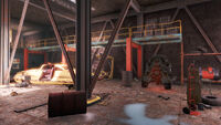 Both ways lead to the same final room, which is a much larger workshop area inhabited by an assaultron, and two protectron units. A dormant sentry bot also resides here, and will explode if fired upon, or if the Sole Survivor hacks and activates it using the Robotics Expert perk. There are two destructible cars (as well as a few gasoline containers on a shelf towards the back) which can be used to destroy (or at the very least greatly damage) this room's many robots. The room contains an armor workbench and a weapons workbench, as well as a power armor station.
