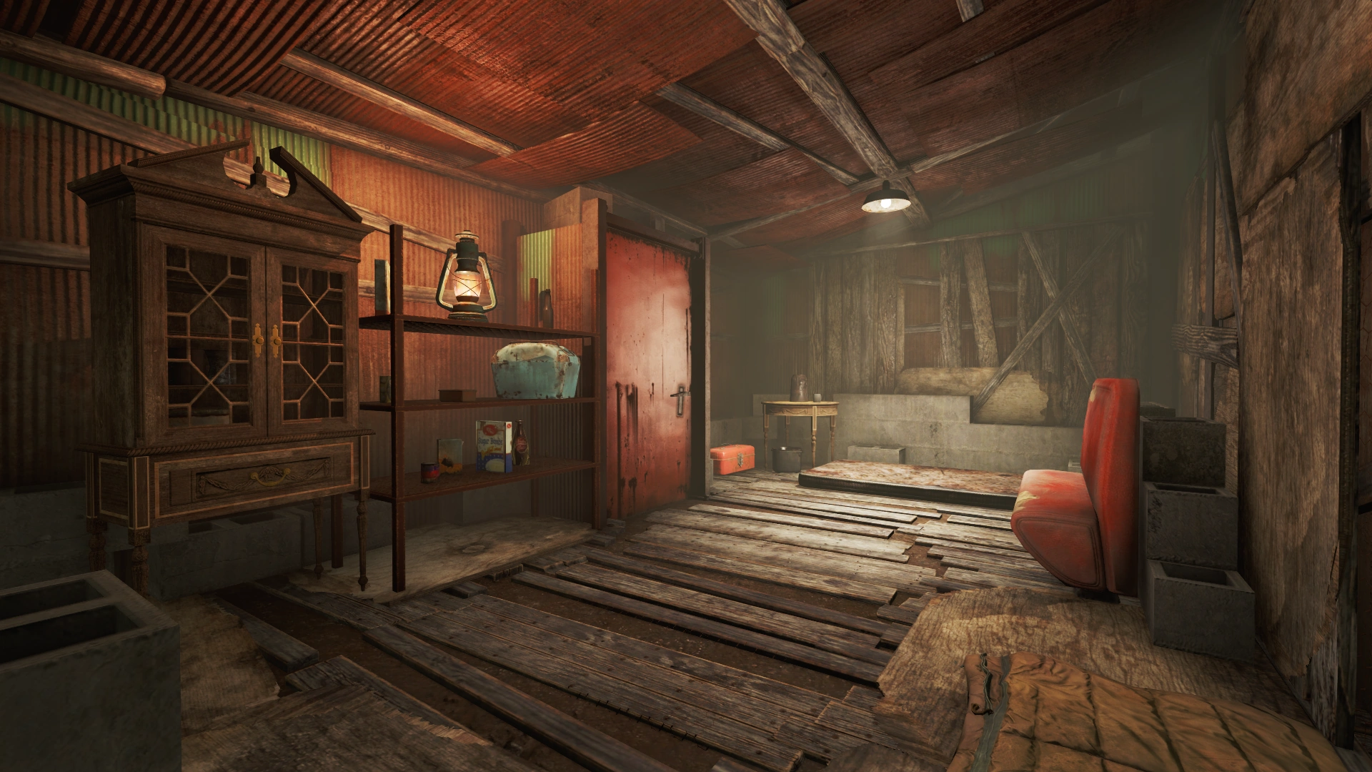 This house in the city's infield (near the intersection of Third and Home Streets) consists of one small room with an owned mattress , an owned sleeping bag , and a set of metal shelves with meager food supplies. A curio, a bench, a small table, and a toolbox are the only remaining furnishings.