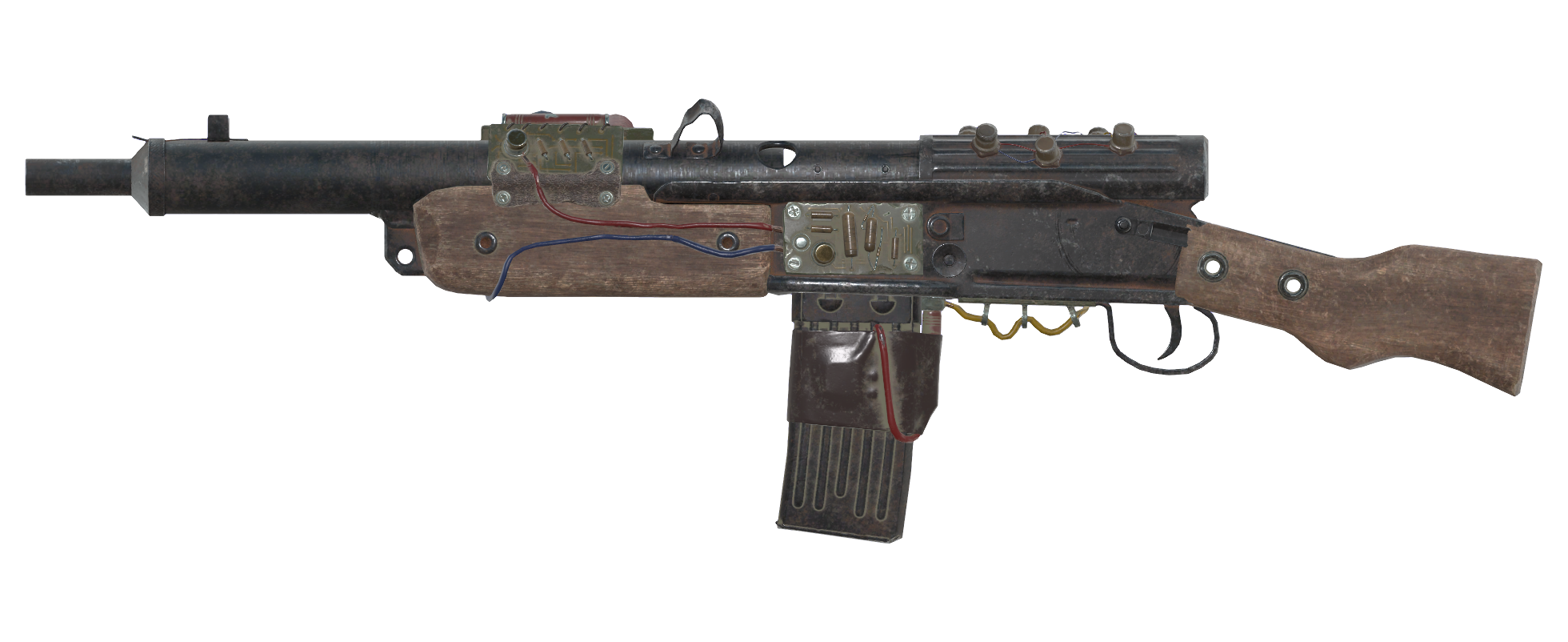 Pistols .44 pistol (Eddie's Peace , The Gainer , Kellogg's pistol ) · 10mm pistol (Deliverer ) · Classic 10mm pistol (Ultimatum ) · (Acid Soaker ) · Flare gun · Western revolver Shotguns Combat shotgun (Le Fusil Terribles , Justice ) · Double-barrel shotgun · Handmade shotgun (Triple-barrel handmade shotgun )SMGs Submachine gun (Silver submachine gun , Spray n' Pray )Rifles Anti-materiel rifle · Assault rifle · Combat rifle (December's Child , Overseer's Guardian ) · Handmade rifle (Splattercannon , The Problem Solver ) · Hunting rifle (Reba II , Tinker Tom Special ) · Lever-action rifle (Old Reliable , Lucky Eddy ) · Manwell carbine (Manwell rifle ) · Radium rifle (Kiloton radium rifle , Radical Conversion ) · Railway rifle (Prototype railway rifle ) · Syringer Heavy weapons (Broadsider ) · Fat Man (Big Boy , Nuka-nuke launcher , The Striker ) · Harpoon gun (Admiral's Friend , Skipper's Last Stand ) · (Junk Jet ) · Minigun (Ashmaker ) · Missile launcher (Death From Above , Partystarter ) Other Paddle ball · Pipe bolt-action · Pipe gun · Pipe revolver · Thirst Zapper