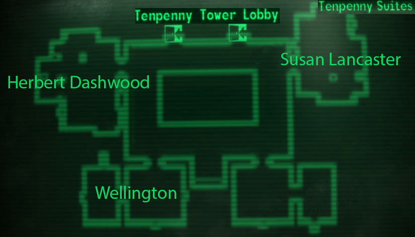 第一次進入塔樓時,你會處在大廳的區域。有一些商店在主要區域分支出來的部份,在樓上有供居住的房間, 房間樓層的入口在後面的樓梯上,還有通往頂層套房的電梯。 房間樓層再建築物的三樓,且圍繞著電梯井排列。 亞利斯塔爾·特佩尼,毆文·成,伯克先生和蘇珊·蘭卡斯特皆居住在頂層套房樓層,其中一間套房在通過任務原子之力後可被玩家取得。值得注意的是,從商店主人的金庫偷東西是可行的,這麼做會讓他們抱怨安全問題並離開,這也代表將不能再與他們做交易。