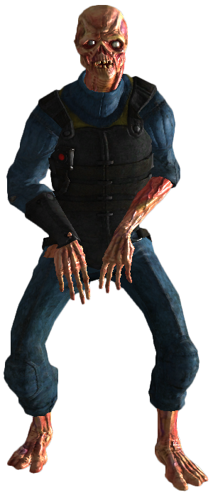 A glowing one wearing a RobCo Industries jumpsuit. This type of ghoul was cut from the game. Despite being a 'glowing one,' this variant has a very low amount of health, equal to regular low level feral ghouls.