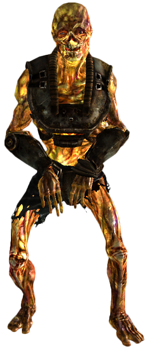 Their Hit Points in the game can vary; at lower levels, they are merely slightly stronger than a feral ghoul roamer, but are weaker than a glowing one. They wear what appears to be the remnants of metal armor. Some can be found at the old nuclear test site, outside Hell's Motel at Mesquite Mountains crater and one will always spawn inside the sealed sewers, regardless of the Courier's level.
