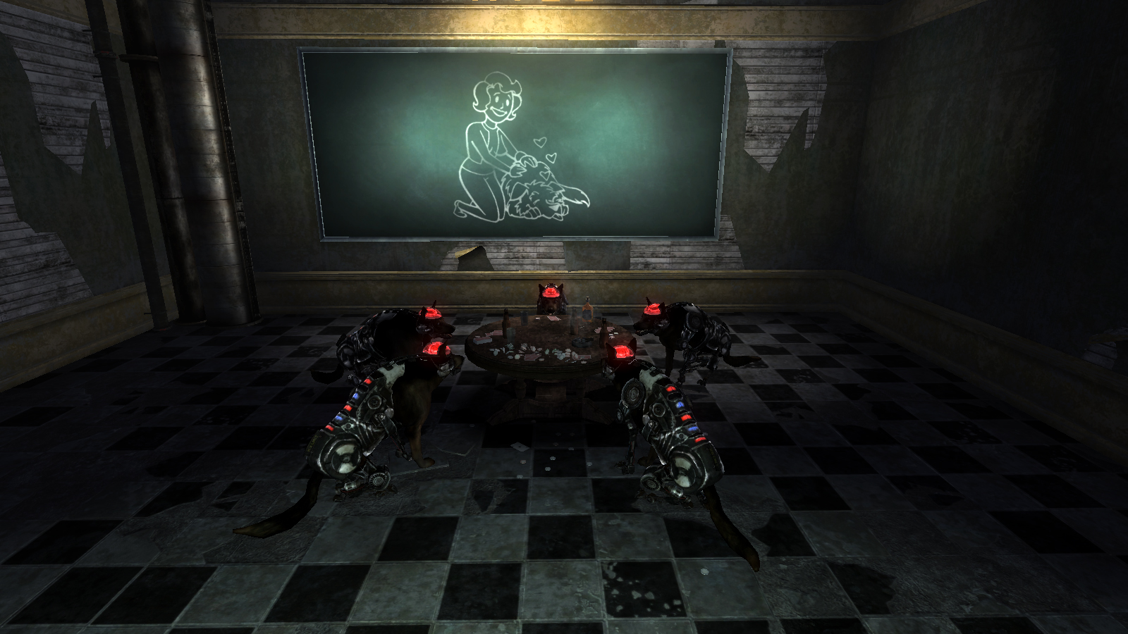 区域后,透过窗户可以看到一个房间,里面有五只电子警犬。它们通常都会乖乖地坐着,观看避难所女孩安慰狗狗的幻灯片(这长幻灯片本身就是在致敬被取消的辐射:钢铁兄弟会2 中的“人类最好的朋友”特技)。拥有狂野废土特征,它们会围坐在一张桌子面前,上面堆满了扑克牌、筹码和酒水。这是在致敬著名的“玩扑克的狗狗(Dogs Playing Poker)”系列画作。在辐射:战略版 中有一个与之类似的奇遇叫做:“婆罗门扑克Brahmin Poker”。