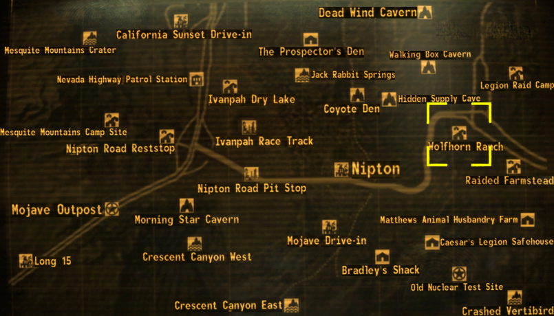 Calada ·Corn Creek Dunes ·Devil Peak ·Dry Lake ·East Las Vegas ·Elephant Hill ·Floyd Lamb State Park ·Garnet ·Gomorrah 3rd floor ·Las Vegas Academy ·Las Vegas Bay Campground ·Las Vegas Dunes ·Malpais Legionnaire Camp ·Mountain Springs ·Mt. Perkins ·Mummy Mountain ·Northwest sewers ·Pahrump ·Piute Point ·Ripley ·Sandy Valley ·Southwest sewers ·Spring Mountains Recreation Area ·Summerlin ·Sunrise Mountain ·Underpass ·Valley of Fire ·Wheaton Springs · Vault 24 · Vault 74