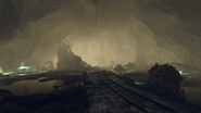 The glassed cavern is a former mining complex consisting of long underground passages. The tunnels are a lengthy slog through hordes of Scorched. The entrance tunnel terminates in a cave-in that requires player characters to navigate through a side tunnel and two caverns containing AMS' maintenance equipment and the laboratory. This segues into the auto-miner maintenance point and a loading dock. The next stage leads to a curving cavern with a waterlogged shelter area and another small junction with a power armor frame. Along with the multiple Scorched that inhabit the mine, a scorchbeast is found near the exit elevator. Corpses of fog crawlers, cave crickets and mirelurk kings litter the complex. There are also multiple scorchbeast bodies around the caverns along with the bodies of Brotherhood of Steel soldiers that killed them. The complex ends with a big cavern, where the body of Paladin Taggerdy, half-buried against the eastern wall, can be found and her final moments can be heard on a transmitter. There is a mine elevator in the back of the cavern that leads topside.