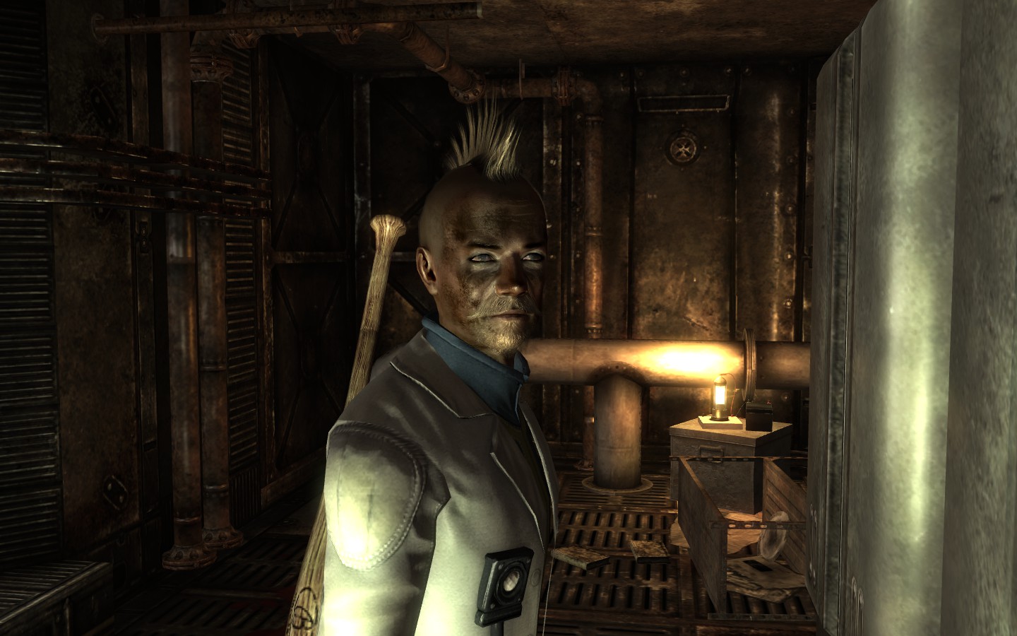 A descendent of original vault dwellers, the survivor has been left insane by the psychoactive drugs that are still being pumped through the air systems of Vault 106 as a result of the Vault's experiment. Because of this, the survivor only functions on primal reflexes.