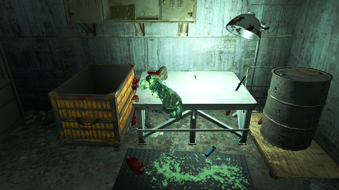 再往前一点是一个房间,里面有一些狂尸鬼,墙上有一个洞通往隧道,还有一个破碎的金属楼梯。如果使用动力装甲或喷气背包,可以使用喷气背包跳到楼梯的顶部,跳过大部分地下城。隧道是相当线性的,但在第一个地方,玩家需要潜入受辐射的水中,在楼梯后面有一个区域可以到达,那里有一些额外的小战利品和高级保险箱。