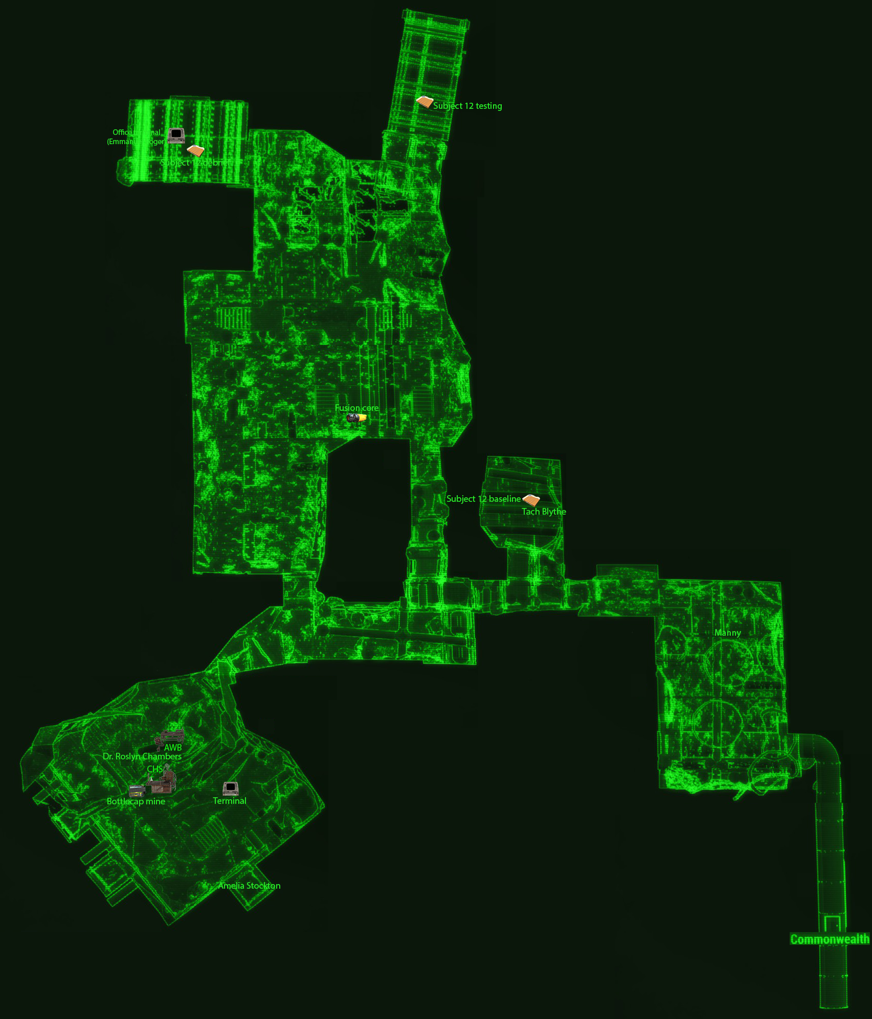 Adjacent to the chamber are three prison cells, one of which contains Amelia Stockton. The chamber is used as a torture chamber by Dr. Roslyn Chambers. If she is killed, the whole base, and Covenant, will be hostile towards the Sole Survivor.