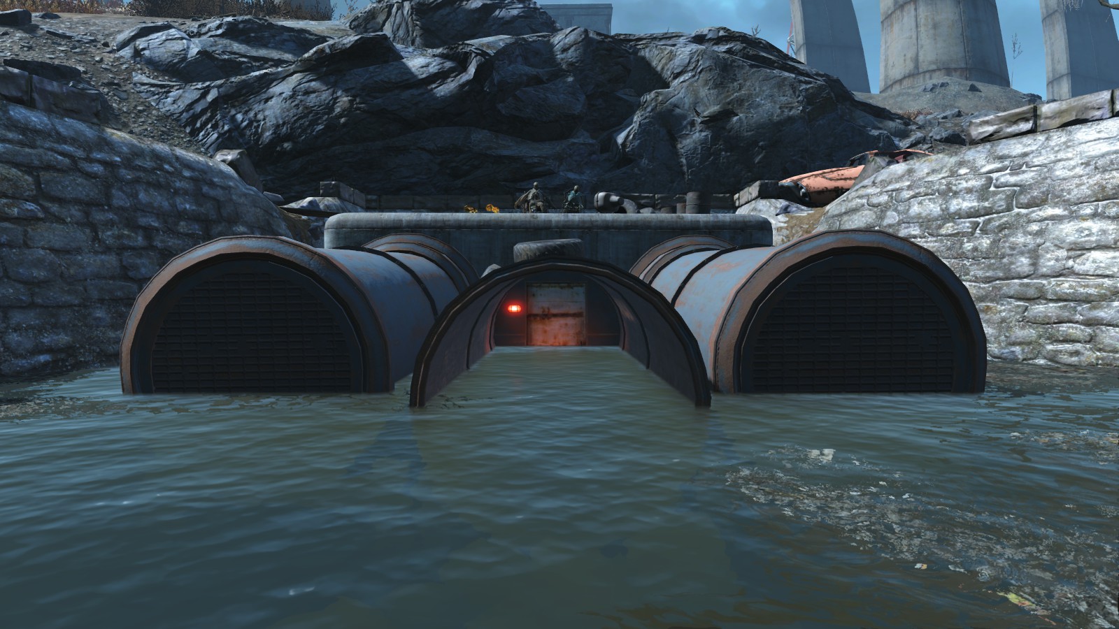 The sewer is a small subterranean section accessible through a door inside a big pipe. The pipe is based partially under water in the lake to the west of Covenant. It is fortified by the Compound guards. The last chamber features a chemistry station, an armor workbench and a terminal.