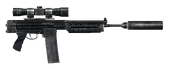 This assault rifle is a long, cylindrical-barrel design which does not resemble any past version. It features a side-fed magazine which houses 30 5.56mm rounds (can be upgraded to hold up to 80), and is available in either semi-automatic or fully automatic variations. It offers immense recoil control and remains very easy to keep under control, even when fully automatic.