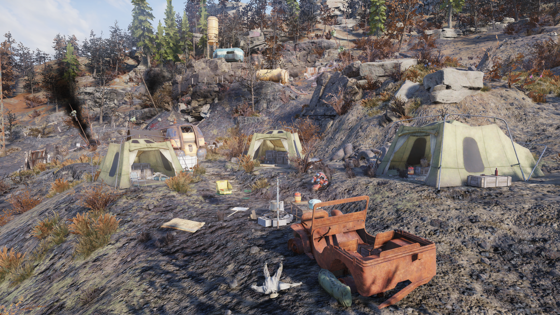 This campsite was used as a coordination area by union workers rebelling against automation in Appalachia before the Great War. Things did not end well for them, however, as indicated by the possible presence of Scorched or Mister Gutsy strikebreakers.