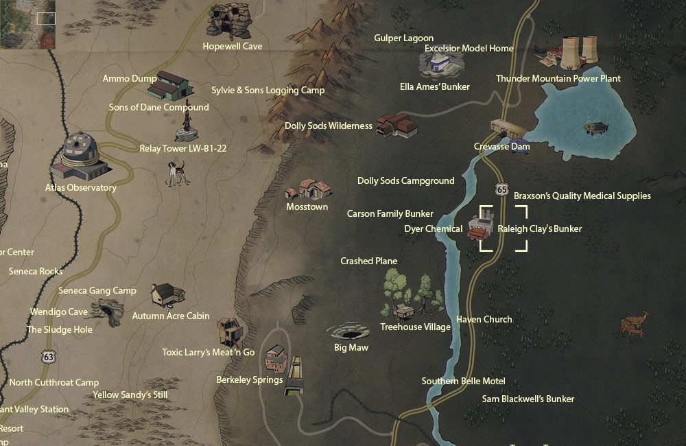 Raleigh Clay's bunker is a location in the Mire region of Appalachia in 2102. It was the personal bunker of Raleigh Clay, leader of the Free States.