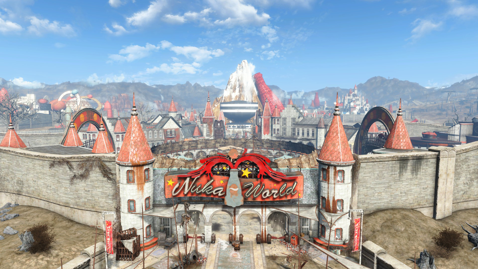 Nuka-Town USA continues to be a thriving trading post, with the Nuka-Town market serving as its central hub. To the west is the Bradberton Amphitheater, home of the Pack. To the immediate north is The Parlor, which serves as the base for the Operators. North of that is Fizztop Mountain, controlled by the Disciples, and Fizztop Grille, which serves as Overboss Colter's home.