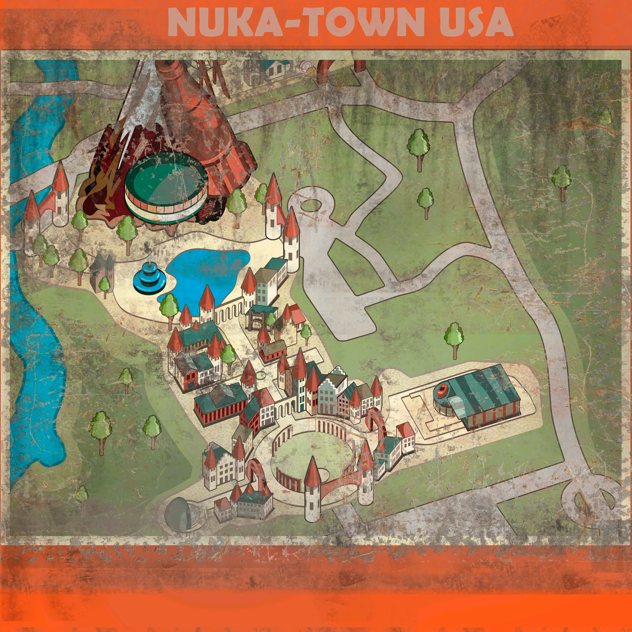 The nucleus of the Nuka-World amusement park, Nuka-Town USA opened on May 1, 2050, alongside Kiddie Kingdom.[1] Nuka-World's opening day saw tremendous success with over 40,000 tickets sold. Due to the overwhelming success, plans to expand Nuka-World were immediately set in motion.[2] The locale hosted several attractions for families, including eateries like Cappy's Cafe, the Fizztop Mountain and Grille, and The Parlor, as well as the Bradberton Amphitheater for a variety of shows, and the Cola-cars arena and Nuka-Cade for more interactive entertainment. Nuka-Town was also the site of the personal office of Mr. John-Caleb Bradberton, the inventor of Nuka-Cola.