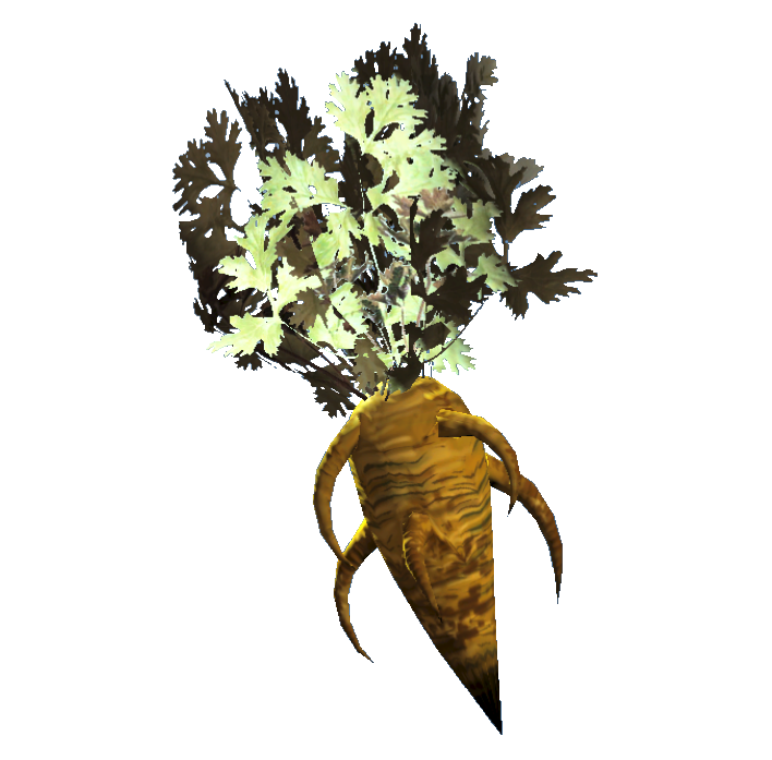 A long, orange vegetable with thick off-shooting roots branching from the main taproot. If Survival mode is active, this item will reduce hunger by 3 points.