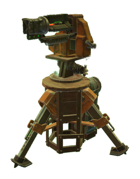 Semi-automatic laser gun on a tripod. It requires power to function and has lower rate of fire than the machinegun turrets, but makes up for it in accuracy and range which allow it to be placed in very high places effectively.