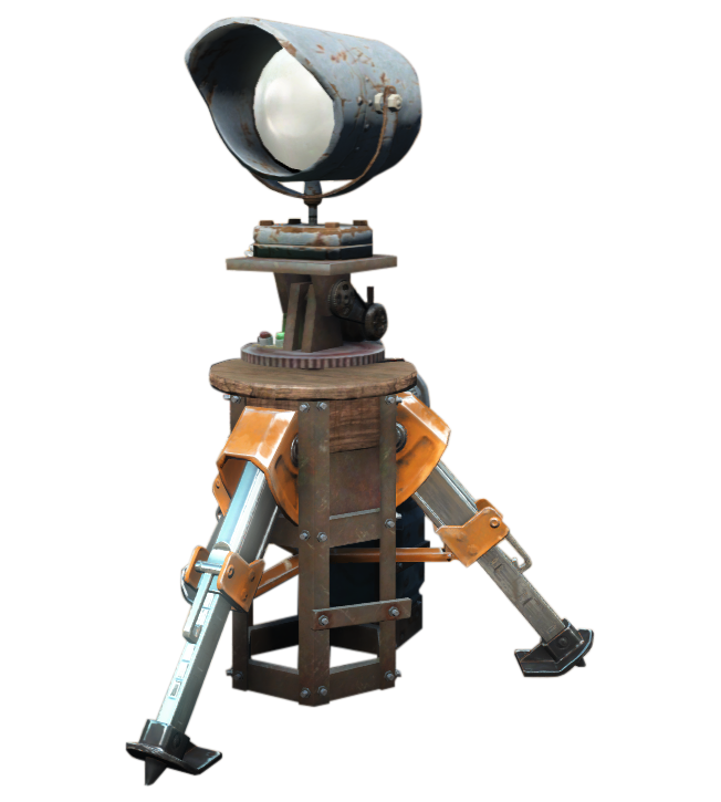 The spotlight turret is installed on a tripod pedestal and produces a light that locks onto enemies when they get close enough. It requires 2 Energy from a generator in order to provide 2 Defense for the settlement. They can be set to target the player character using a linked terminal.
