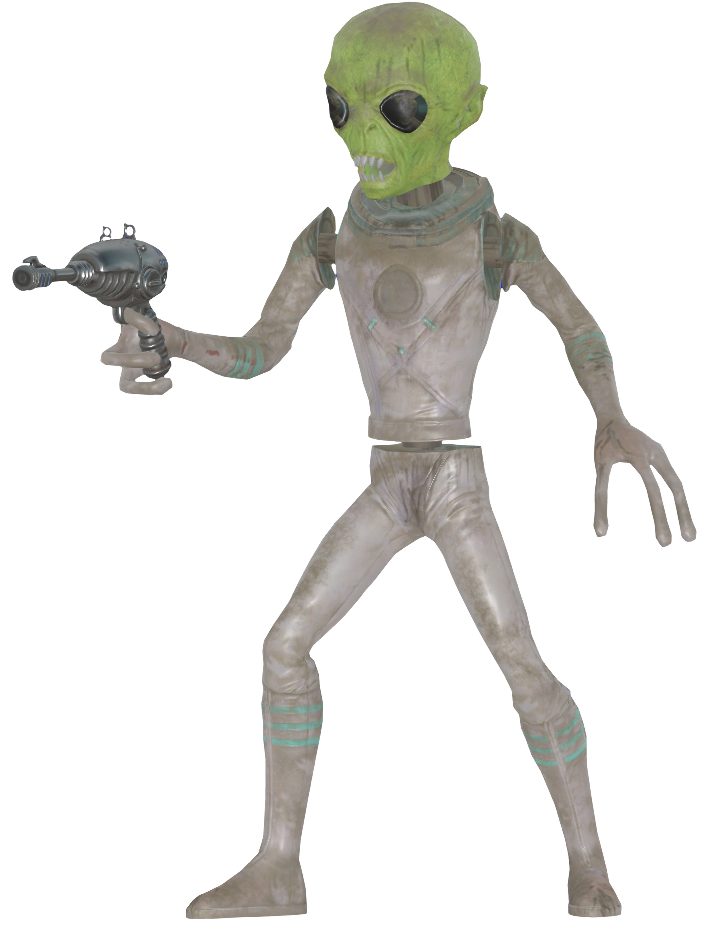 These are animatronic dummies that are part of Nuka-World's Galactic Zone attraction but also appear in The Gauntlet and the Nuka-World junkyard, in the form of Zetans. They are, however, armed and programmed to attack intruders. They more closely resemble the aliens as they appeared in Fallout 3, even having the same looking alien blaster.