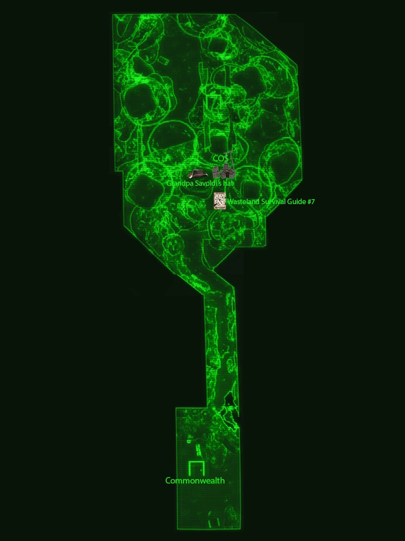 A former neighborhood swallowed by a giant sinkhole that formed sometime after the Great War, the Old Gullet sinkhole now only contains a single deathclaw near the center. A river flowing down into the crater leads to a cavern underneath the sinkhole, and is the only entrance to the lower parts of the cave (upon initial discovery). Inside, the corpse of a brahmin and three dead raiders (one is partially obscured underneath the falling water) can be seen, along with a fair number of radroaches. The only exit will take the Sole Survivor past a small pack of feral ghouls.