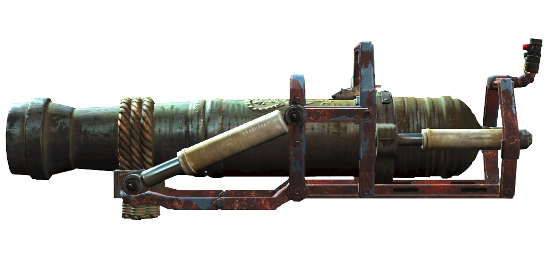 An unusual heavy weapon mixing 18th-century ordnance with 23rd-century technology. The main body consists of a small old-fashioned naval cannon strapped to a makeshift rig with metal rivets and thick ropes. This rig allows it to be carried around with both hands easily and includes a hinge allowing the cannon to be angled vertically for easy reloading. It fires explosive cannonballs via an electronic trigger taped to the back handle.