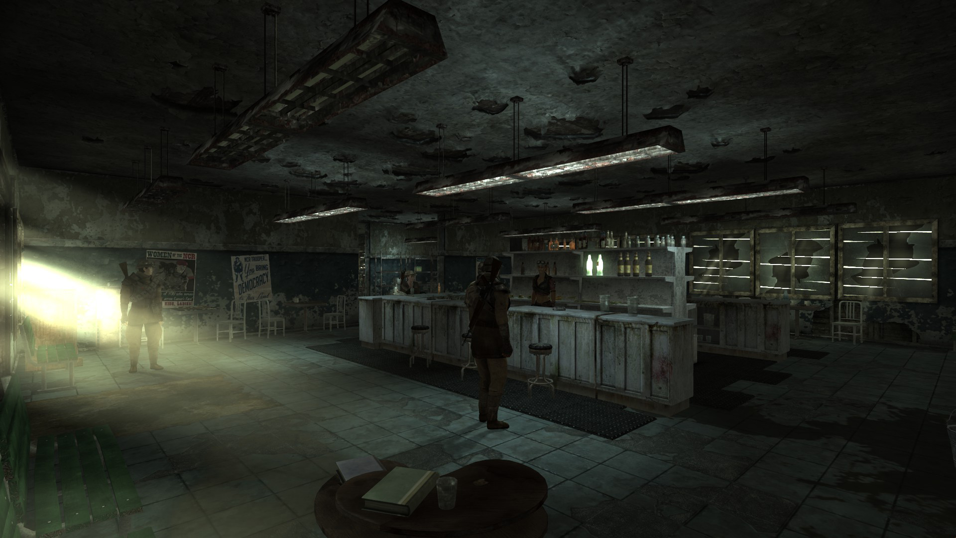 The building is populated with many NCR troopers, Lacey, Rose of Sharon Cassidy, and a caravaneer. The NCR sniper Ranger Ghost can be found in her overlook on the roof. In addition, two satellite dishes stand on the roof, one on the headquarters side and one on the barracks, pointing west.