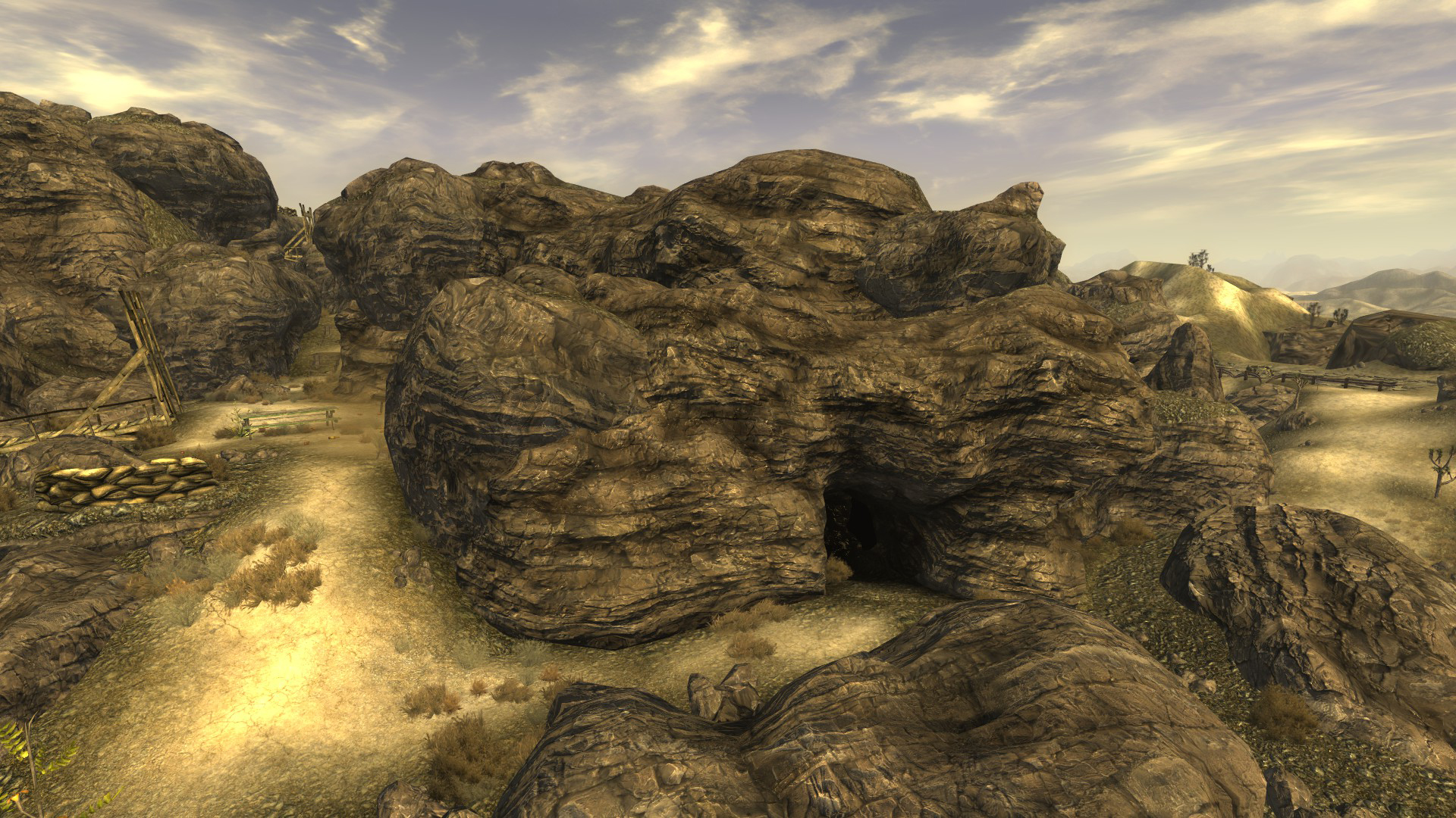 The Camp Guardian cave is a unmarked location in the Mojave Wasteland in 2281. The two entrances to Camp Guardian cave are found on the path leading up to Guardian Peak. This cave should not be confused with the much larger Camp Guardian caves. The location is mentioned briefly in the Camp Guardian daily logs found on the path leading to its lower entrance.