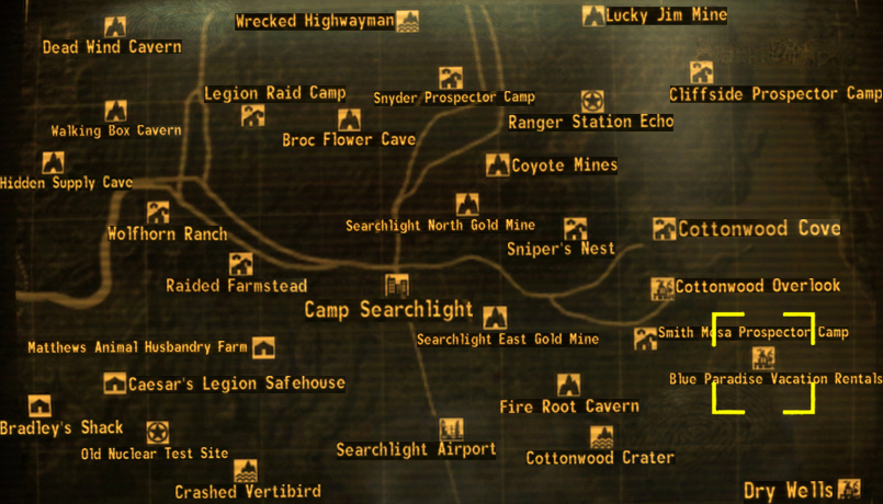 Calada ·Corn Creek Dunes ·Devil Peak ·Dry Lake ·East Las Vegas ·Elephant Hill ·Floyd Lamb State Park ·Garnet ·Gomorrah 3rd floor ·Las Vegas Academy ·Las Vegas Bay Campground ·Las Vegas Dunes ·Malpais Legionnaire Camp ·Mountain Springs ·Mt. Perkins ·Mummy Mountain ·Northwest sewers ·Pahrump ·Piute Point ·Ripley ·Sandy Valley ·Southwest sewers ·Spring Mountains Recreation Area ·Summerlin ·Sunrise Mountain ·Underpass ·Valley of Fire ·Wheaton Springs · Vault 24 · Vault 74