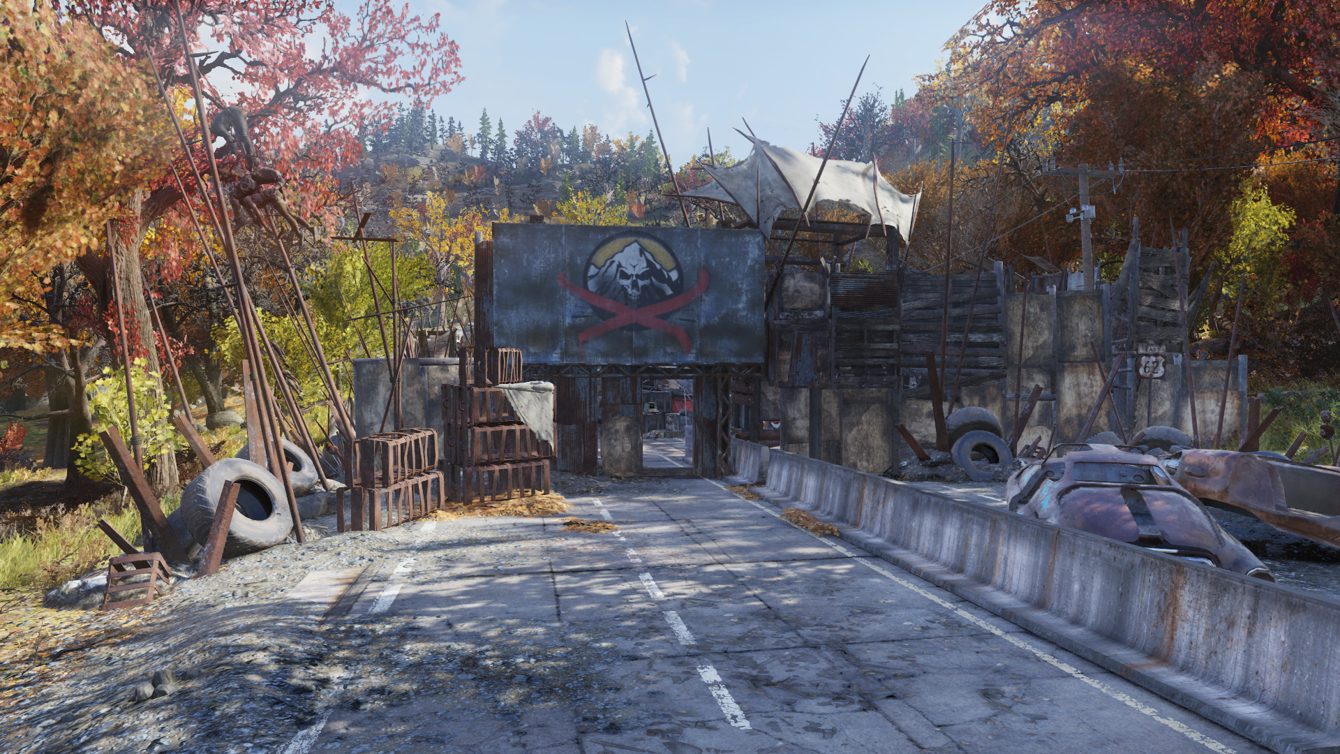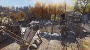 The camp itself has been set up in the style of a movie theater. There are a variety of seating options such as ski lift chairs elevated on an old truck trailer, couches, airplane seats, and basic metal chairs. These seats face a makeshift movie screen which now has a stingwing hive built on it. There is a trunk at the foot of the makeshift screen and a fusion generator to its east which is used to power the camp.