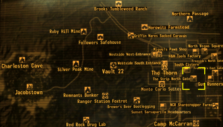 - A bug occurs wherein after having the gate unlocked through a passport or chip-check, it will become relocked later with a key only lock. To fix this, enter The Strip via the monorail from Camp McCarran and then leave the Strip via the main gate. The gate will now be unlocked from the outside. If you don't have enough reputation with the NCR to enter the monorail, you may kill a Securitron guarding the entrance with a sniper rifle as shown below.[已验证]