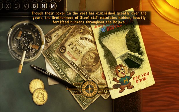 The loading screens feature media from the Mojave Wasteland setting, such as ads related to the casinos of New Vegas, NCR propaganda posters, and posters for the voting blocs from Vault 11. The loading icon is a roulette wheel instead of a clock or vault door. The three lines radiating out from the roulette wheel are from the insignia of Vault-Tec Industries, similar to those seen in Fallout and Fallout 2 load/save screens. Amongst the pre-War advertisements on the loading screens is a poster for Dean Domino, a pre-War lounge singer who appears in the Dead Money add-on. They give many gameplay hints.