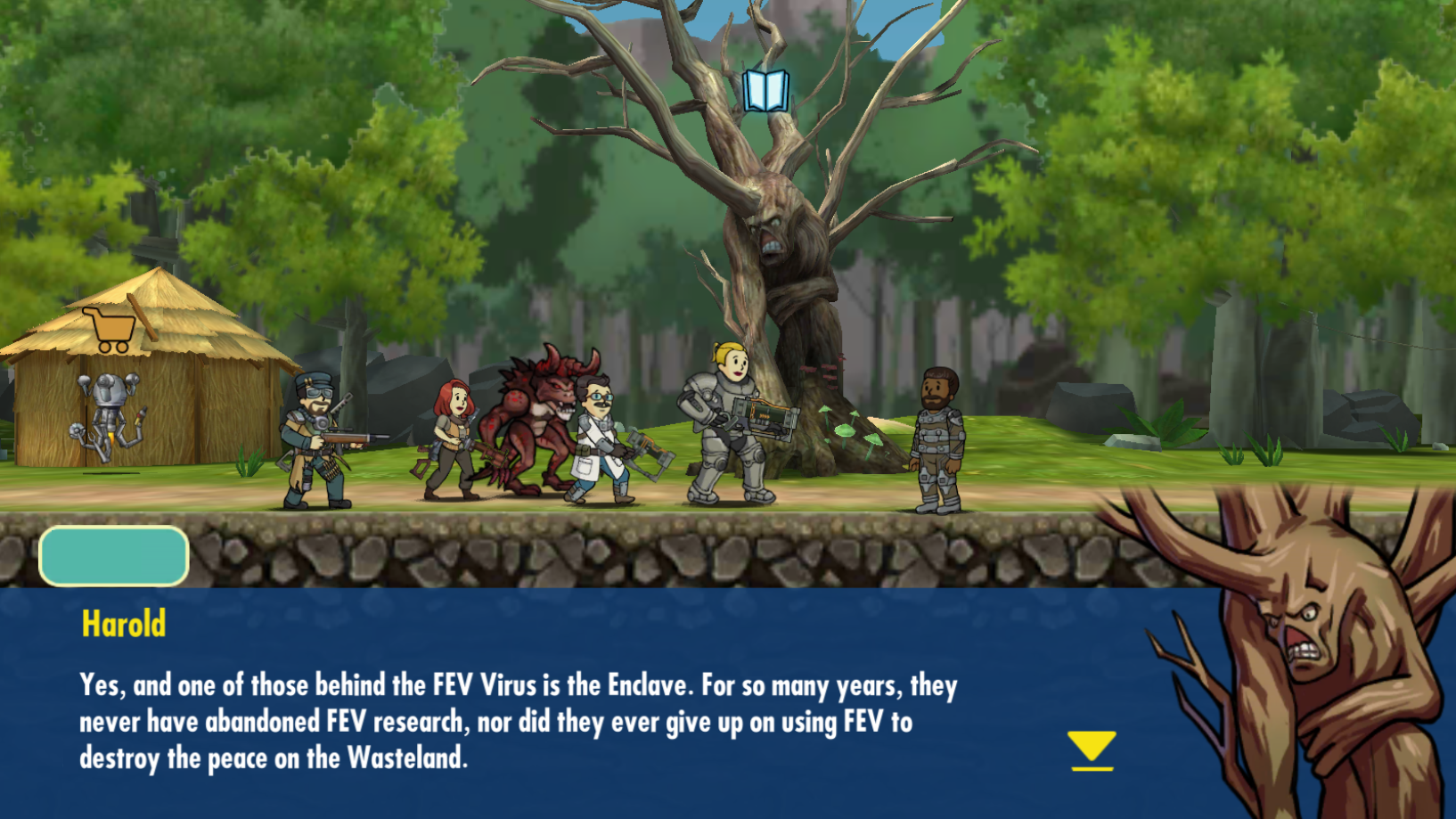 在绿洲,汉尼拔向大家介绍了一个名叫哈罗德的树状生物。哈罗德认为英克雷对他感兴趣。哈罗德透露,很久以前他曾经是一个普通的废土商人,但在一次冒险中,他因为严重感染了FEV而在头上的生出一棵小树苗。小树苗长大了,和他合二为一,成了他现在的样子。哈罗德透露,英克雷是FEV的幕后黑手,因此他们对他感兴趣。哈罗德向小组提供了英克雷在更西边的总部的情报。