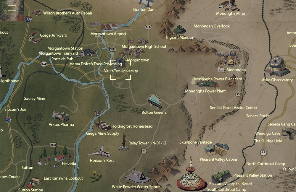 - ↑ 1.0 1.1 Fallout 76 loading screens: "In 2031, Vault-Tec re-branded Morgantown's local college as Vault-Tec University, and some of their top executives and scientists either taught or graduated from there. Go Fighting Wendigos!"